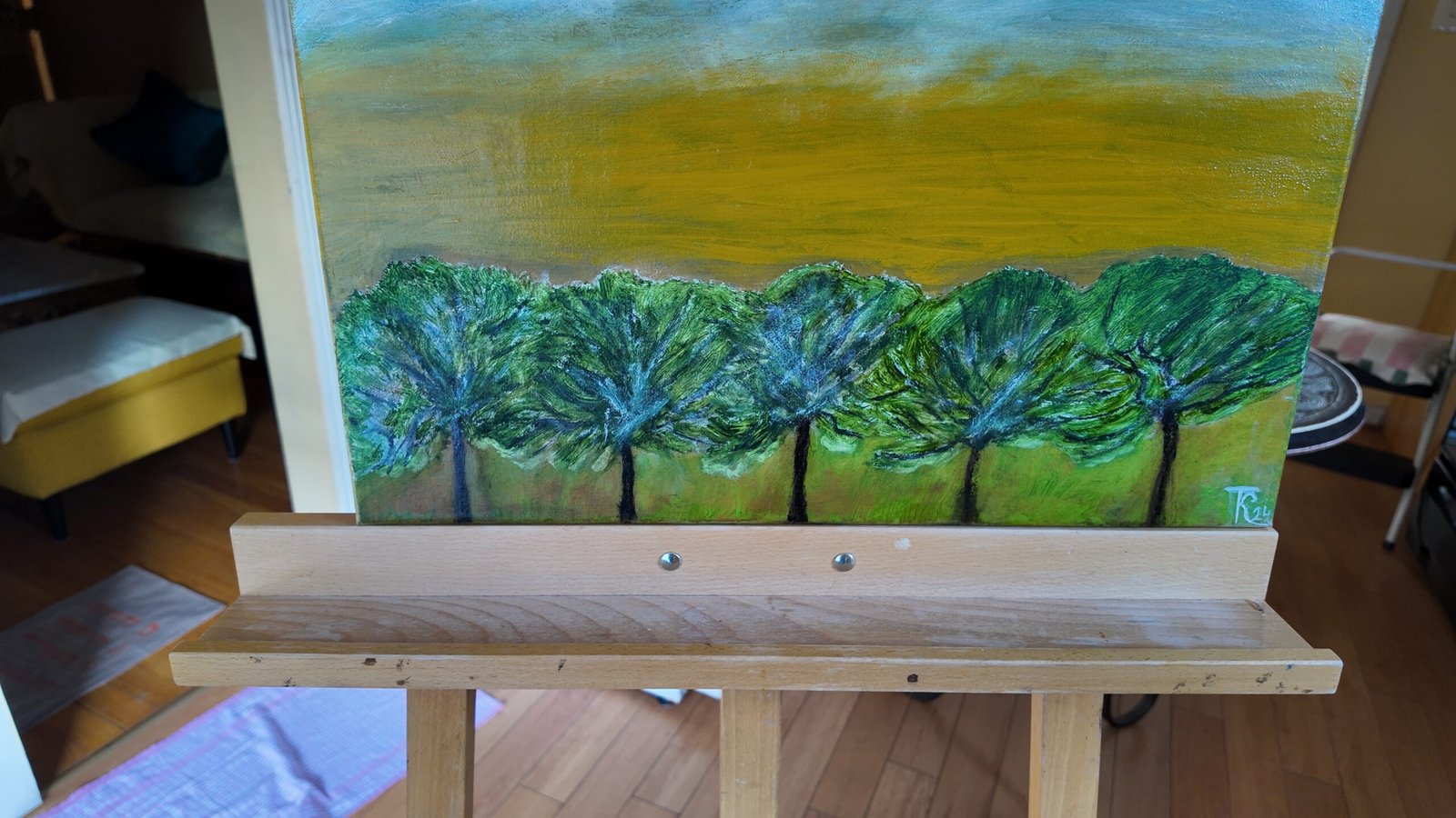 Expressive Brushwork: The foreground features energetic, textured strokes of deep green, echoing the expressive, modernist techniques of the 1960s Armenian “Thaw” period. This active brushwork breathes life and movement into the trees, grounding the viewer in the immediate moment.